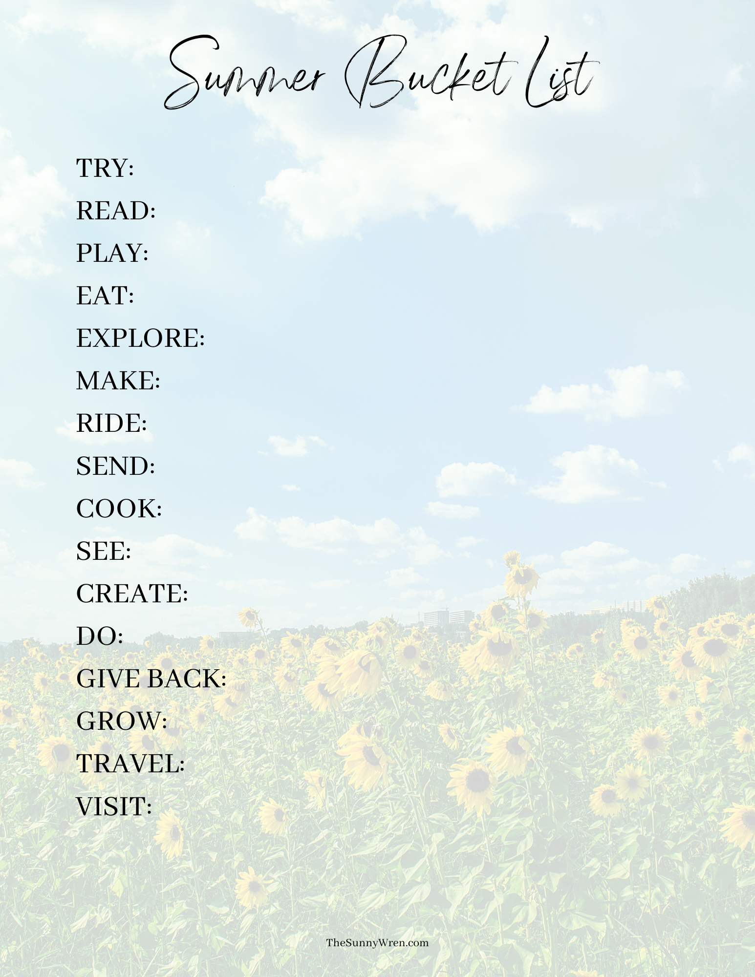 Create ideas for something to TRY, READ, PLAY, EAT, MAKE, RIDE, SEND, COOK, SEE, CREATE, DO, and GROW.